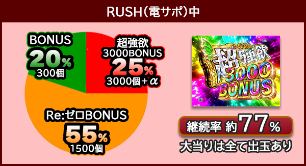 全大当りに出玉があり、通常時から1500個or3000個+α(払い出し)とボリューム感が満点だ。RUSH中の出玉は3種類だ。10R×2回の3000BONUSは、2回目以降の大当りの約25%で1500個(払い出し)を上乗せだぞ!